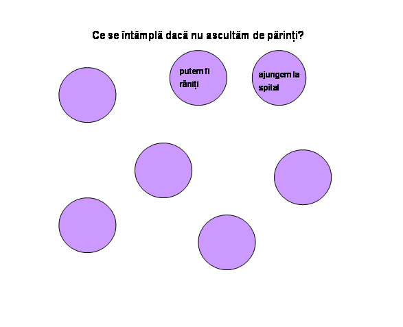 Se propune ca element de centru "consecinte ale neascultarii de parinti", apoi se cer cat mai multe expresii, cuvinte, personaje care le-au ramas lor in memorie. Cuvintele sau ideile produse sunt legate de ideea-nucleu, stabilita ca punct de plecare, prin trasarea unor linii care evidentiaza conexiunile dintre idei. Se completeaza cu un marker pe o plansa - ciorchinele. (F3+F1) |