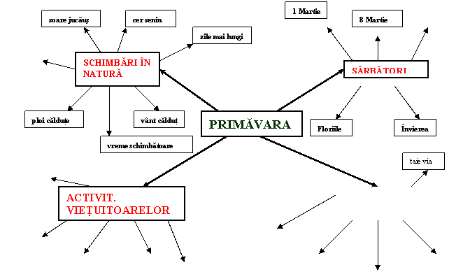 Brainstormingul: Voi cere elevilor ( organizati īn 4 grupe) sa spuna cāt mai multe cuvinte despre primavara, structurate pe urmatoarele tematici- schimbari īn natura,