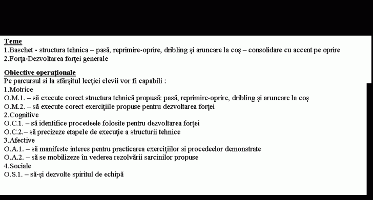 pasarea mingii cu doua mâini de la piept de pe loc pasarea mingii cu doua mâini de deasupra capului de pe loc dribling si aruncare la cos pasa, reprimire - oprire, dribling si aruncare la cos joc bilateral pe teren redus cu tema, fara dribling, pasarea mingii joc bilateral pe teren redus |