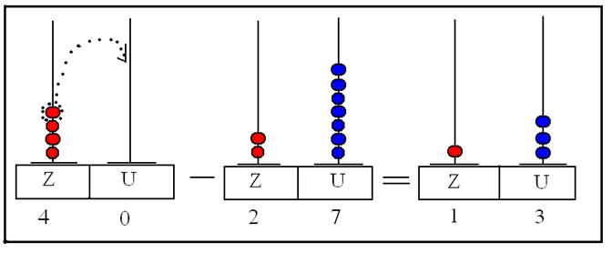 -Copilasi, cum credeti voi ca din 4 pachete de cate 10 betisoare vom lua 2 pachete si inca 7 betisoare ? (Desfacem un pachet si luam 7 betisoare, iar din restul pachetelor, 4, luam inca 2 pachete. Constatam ca mai ramane 1 pachet si 3 betisoare) *Cu ajutorul unei planse le voi explica algoritmul de scadere a unui numar format din Z si U dintr-un numar format din Z. Voi rezolva aceeasi scadere cu ajutorul reprezentarilor. (anexa 2) -Copii, ce numar am reprezentat eu pe primul desen ? (40) -Iar pe al doilea ? (27) -Eu acum vreau sa scad pe 27 din 40, cum calculez ? Putem sa luam 7 unitati din 0 unitati ? (Nu ) -Atunci, transformam o zece in unitati si o trasportam pe vergeaua ce corespunde unitatilor. Acum 10 – 7 = 3 -Iar acum cate zeci ne-au ramas din 4 daca am luat o zece ? (3 zeci) -Deci, calculam: 3 – 2 = 1 -Rezultatul scaderii este 13! (Pe care l-am asezat pe a treia reprezentare. Vertical!) *Pe o alta plansa vom rezolva un exercitiu prin aceeasi metoda. (anexa 3) *Exercitiu si problema pe tabla. (anexa 4) |