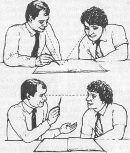 Când purtam o discutie de afaceri, sa ne imaginam un triunghi pe fruntea celeilalte persoane. Prin mentinerea privirii noastre numai asupra acestei zone, cream o atmosfera serioasa si partenerul îsi da seama instinctiv ca afacerea ne intereseaza. Cu conditia ca privirea noastra sa nu coboare sub nivelul ochilor celeilalte persoane, vom putea pastra controlul asupra desfasurarii discutiei.