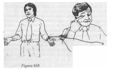 Figura 166. Este un grup clasic de gesturi menit sa induca în eroare, în timp ce îsi freaca un ochi, are privirea îndreptata spre podea si sprâncenele ridicate în pozitie de neîncredere. Capul întors într-o parte si usor aplecat reflecta o atitudine negativa. Are si un zâmbet fals, cu buzele strânse.