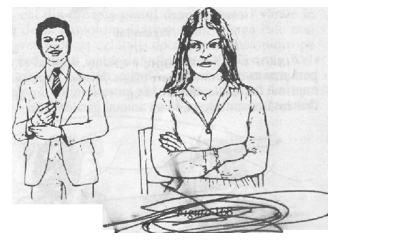 Figura 168. Aceasta femeie are o parere proasta despre cel la care priveste. Nici capul, nici trupul ei nu sunt întoarse catre acesta, în schimb îi arunca o privire laterala, are capul lasat usor în jos (dezaprobare), sprâncenele strânse (mânie), bratele complet încrucisate (defensiva), iar coltul buzelor lasat în jos.