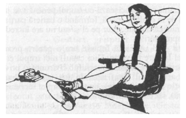 Figura 169. Dominarea, superioritatea si pretentia teritoriala sunt evidente aici. Cele doua mâini tinute pe ceafa denota o atitudine superioara de "atotstiutor", iar picioarele asezate pe masa de lucru exprima revendicare teritoriala. Scaunul rabatabil pe rotile si telefonul modern - la care pot aspira numai persoane cu rang înalt - accentueaza si mai mult statutul sau social. El sade în pozitie defensiv/competitiva.