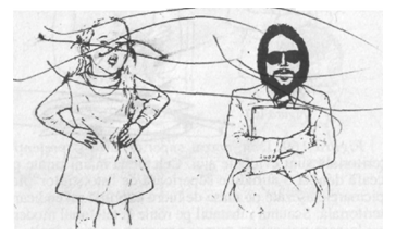 Figura 182. Aici gesturile protagonistilor indica deja cu claritate atitudinile si sentimentele lor. Barbatul din stânga sta si acum cu degetele mari vârâte în cureaua de la pantaloni, cu laba piciorului împinsa înainte si trupul usor înclinat spre femeie, manifestând din plin intentiile sale de curtenire. Degetele lui mari strâng mai tare cureaua, gestul devine astfel mult mai evident, iar trupul si-l tine, daca se poate, si mai drept. Femeia raspunde prin propriile sale gesturi de curtenire, aratând ca barbatul o intereseaza: îsi desface bratele pâna atunci încrucisate, se întoarce cu trupul spre el, iar laba unui picior o are îndreptata tot catre el. Gesturile sale de curtenire mai cuprind aranjarea parului, etalarea încheieturii mâinilor, împingerea înainte a sânilor si scoaterea în evidenta a crapaturii bluzei si expresia faciala pozitiva. Fumul de tigara c trimis în sus (încredere în sine). Barbatul din dreapta parc a fi neplacut surprins de exclude ca sa si recurge la gestul mâinilor la solduri (pregatire agresiva), pentru a-si manifesta neplacerea.