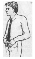 Figura 165. Excelent exemplu pentru grupul de gesturi exprimând sinceritate, în pozitia de supunere palmele sunt larg deschise, degetele îndepartate sporind efectul gestului. Capul este într-o pozitie neutra, bratele desfacute si picioarele îndepartate. Gesturile acestui barbat transmit o atitudine umila, neamenintatoare.