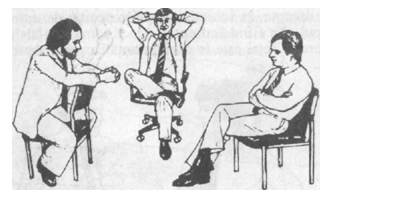 Figura 178. în aceasta scena gesturile celor doi asezati în cele doua parti luteran reprezinta imaginea-oglinda a gesturilor celuilalt. Ei manifesta mult interes unul fata de celalalt, mâinile le tin în asa fel încât încheietura sa ramâna neacoperita, picioarele lor încrucisate fiind îndreptate în directia celuilalt. Barbatul din mijloc zâmbeste cu buzele închise, ceea ce ar putea însemna ca î! intereseaza cele spuse de individul din stânga, dar aceasta nu este în concordanta cu celelalte gesturi faciale si ale trupului. Capul îi este lasat putin în jos (dezaprobare), sprâncenele strânse (suparare), privirea lateral spre celalalt, în plus, bratele si picioarele sale sunt strâns împletite (pozitie defensiva). Toate acestea indica faptul ca are o atitudine foarte negativa.
