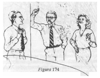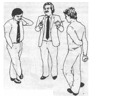 Figura 176 Barbatul din stânga si cel din dreapta stau într-o formatiune închisa, comunicând prin aceasta celui din mijloc ca nu este acceptat la conversatie. Atitudinea barbatului din mijloc exprima superioritate si sarcasm. Gestul apucarii reverului este combinat cu gestul ridicarii degetului mare (superioritate), cu celalalt deget nare aratând spre barbatul din stânga sa (ridicol), care reactioneaza, pe de o parte, prin defensiva - împletirea picioarelor, iar pe de alta parte prin atitudinea agresiva - apucarea bratului superior (stapânire de sine) si privire laterala. Nici barbatului din stânga nu-i convine comportamentul celui din mijloc, îsi încruciseaza picioarele (pozitie defensiva) si priveste podeaua în timp ce se freaca pe ceafa.