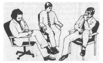Figura 179. Gesturile folosite de barbatul din stânga sunt semnale elocvente ale unei atitudini deschise si sincere - palmele etalate, piciorul împins înainte, capul ridicat, sacoul descheiat, bratele si picioarele neîmpreunate, trupul aplecat înainte, pe fata un zâmbet. Din nefericire însa, ceea ce spune nu este receptat în mod favorabil. Femeia sade usor înclinata pe spate, cu picioarele încrucisate în alta directie (atitudine defensiva), palmele închise (ostilitate), capul lasat putin în jos, folosind si gestul de evaluare critica (mâna adusa la obraz). Barbatul din mijloc foloseste gestul coifului, indicând ca se simte încrezator în sine si superior, cu un picior aruncat peste genunchi, ceea ce denota ca are o atitudine competitiva sau de disputa fata de cel care vorbeste. Putem conchide ca atitudinea sa globala este negativa, acest lucru rezultând si din pozitia în care sade pe scaun - lasat pe spate, precum si din tinuta capului - lasat în jos.