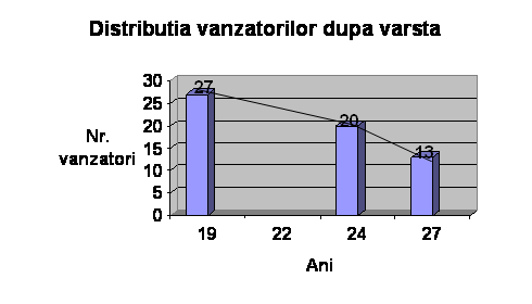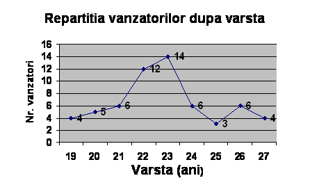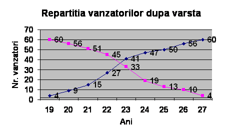 Reprezentarea grafica a repartitiei vanzatorilor dupa varsta se ilustreaza prin poligonul frecventelor si prin curba cumulativa a frecventelor.