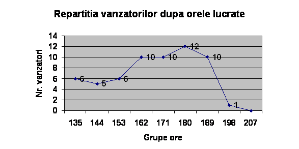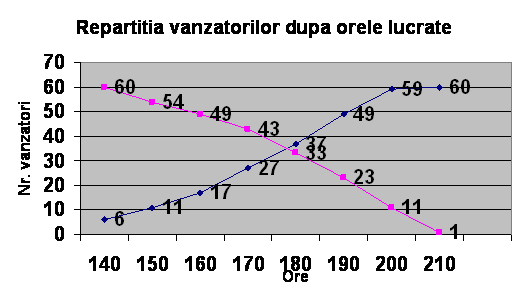 Repartizarea grafica a repartitiei vanzatorilor dupa numarul de ore lucrate se ilustreaza prin poligonl frecventelor si prin curba cumulativa a frecventelor.