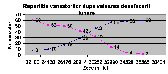 Repartizarea grafica a repartitiei vanzatorilor dupa valoarea desfaceri lunare se ilustreaza prin poligunul frecventelor si curba cumulativa a frecventelor.