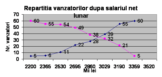 Repartizarea grafica a repartitiei vanzatorilor dupa salariul net lunar, se ilustreza prin poligonul frecventelor si curba cumulativa a frecventelor