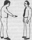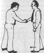 Sunt mai multe metode pentru a para împingerea înainte a palmei cu fata în jos. Poate fi folosita tehnica pasului de dreapta (Figurile 23-25), dar uneori ea este dificil de utilizat, deoarece bratul initiatorului încordat si rigid împiedica punerea sa în aplicare. O manevra simpla consta în prinderea partii de sus a mâinii celeilalte persoane si apoi scuturarea ei (Figura 27).