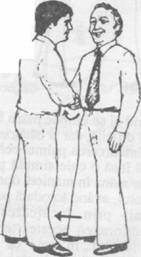 spre stânga (în raport cu el) si suntem de-acum în spatiul sau personal (Figura 25). In încheierea acestei manevre aducem piciorul stâng lânga cel drept, apoi îi scuturam mâna. Aceasta tactica permite sa îndreptam pozitia anterioara a strângerii de mâna si sa întoarcem în pozitie de supunere mâna celuilalt. Ea permite, de asemenea, sa preluam comanda prin patrunderea în zona sa intima,
