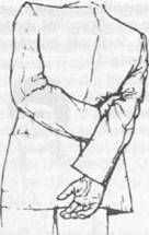 Este interesant de observat ca o data cu cresterea supararii omului, mâna sa dusa la spate ajunge tot mai sus. Individul din Figura 46, de exemplu, face un efort mai mare de stapânire de sine, decât cel din Figura 45, întrucât una din mâinile sale strânge nu încheietura celeilalte mâini, ci bratul superior. Din gesturi de acest tip se subînteleg expresii ca "Ţine-te bine, baiete!". Agentii comerciali recurg adesea la acest gest atunci când, chemati la un potential cumparator, sunt pusi sa astepte în anticamera. Este o încercare palida din partea lor de a-si ascunde nervozitatea si un cumparator istet îsi va da scama probabil de situatie. Daca un gest de stapânire de sine se transforma într-unul de apucare a mâinii cu palma, rezultatul va fi un sentiment de calm si siguranta.