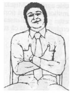 Bratele încrucisate cu degetele mari ridicate (Figura 51) constituie o alta pozitie de gesturi larg raspândite. Avem de-a face cu un semnal dublu, alcatuit dintr-o atitudine defensiva sau negativa (bratele încrucisate) si una de superioritate {etalata prin degetele mari). Persoana care foloseste acest gest dublu, de obicei gesticuleaza cu degetul mare si se leagana.