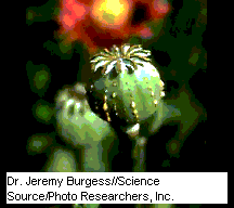 Acest opium poppy arata o capsula cu seminte cu o floare matura in fundal. Opiumul este colectat dupa ce petalele florii au cazut. Se fac niste despartituri pe lungul capsulei, permitand latexului sa iasa afara si sa se intareasca. Dupa ce opiumul de plastic, cauciucat este indepartat, el poate rafinat in heroina, morfina, si codeina - toate formele de analgezice. Opiumul este utilizat ca sedativ si ameliorator de durere in conditii terminale.