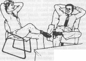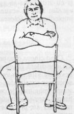 Spatarul scaunului îi apara trupul aidoma unui scut, iar pe el n transforma într-un luptator agresiv, dominant. Majoritatea celor care stau calare pe un scaun sunt indivizi dominanti, care, atunci când încep sa se plictiseasca de conversatie, încearca sa preia controlul asupra altora sau a întregului grup, iar spatarul scaunului le Figura 91. Calare pe scaun asigura o buna aparare împotriva oricarui "atac" din partea membrilor grupului. Cel mai adesea, ei adopta aceasta pozitie în mod discret, aproape pe neobservate.