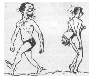 Acest gest, însotit de pupilele marite si un picior îndreptat în directia femeii, este cu usurinta decodificat de majoritatea reprezentantelor sexului frumos. Este un gest care îi tradeaza pe cei mai multi barbati, comunicând femeii, fara voia lor, ceea ce intentioneaza. Acest grup de gesturi este folosit în mod preponderent de barbati, dar faptul ca femeile poarta astazi blugi si pantaloni face posibil ca si ele sa utilizeze aceste miscari (Figura 104). Atunci când o femeie agresiva sexual îmbraca o rochie sau o fusta, degetul marc va fi vârât în cordon sau în buzunar.