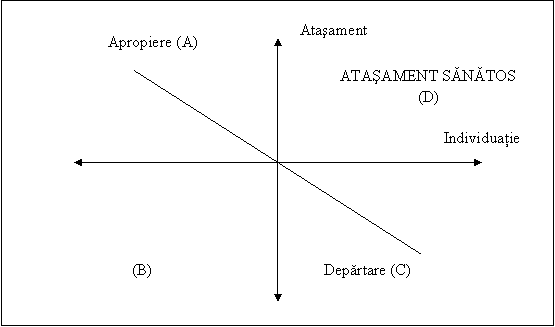 In acest spatiu bidimensional rezulta patru pozitii ce includ cele doua extremitati ale modelului unidimensional dar si doua pozitii ce nu sunt puse în evidenta de modelul anterior. Astfel, acest model defineste distanta interpersonala sanatoasa, nu printr-un nivel mediu de individuatie si de atasament, ci ca un echilibru între cele doua dimensiuni, echilibru corespunzator pozitiei D din figura de mai sus, caracterizata atât prin individuatie cât si prin atasament.