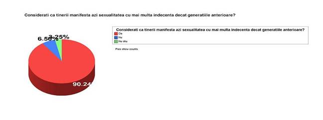 Tinerii isi manifesta azi sexualitatea cu mai multa indecenta, afirmatie rezultata in urma chestionarului ( vezi graficul 1) . Pe de alta parte acestia devin mai responsabili si manifestarile lor sunt o parte a sexualitatii, dar daca ne referim la cat de atenti sunt, la cat de constienti sunt, pot lua masuri sa evite riscurile unui act sexual neprotejat.