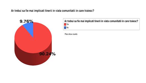 In urma sondajelor realizate, 90,24% dintre cetatenii chestionati de noi din municipiului Bistrita considera ca tinerii ar trebui sa fie mai implicati in viata comunitatii in care traiesc, in timp ce 9, 76% nu considera ca ar fi necesara aceasta implicare.