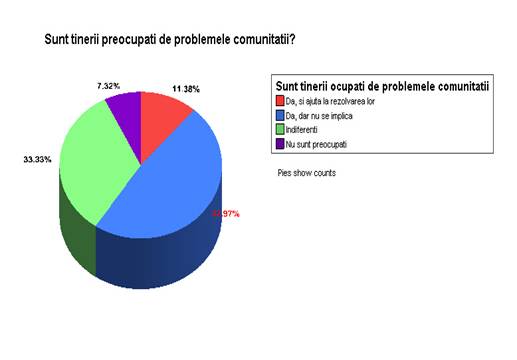 Toate aceste actiuni dovedesc faptul ca tinerii sunt preocupati de problemele comunitatii in care traiesc, desi doar 11,38% dintre cei intervievati de noi considera ca tinerii ajuta la rezolvarea problemelor comunitatii, implicandu-se activ.
