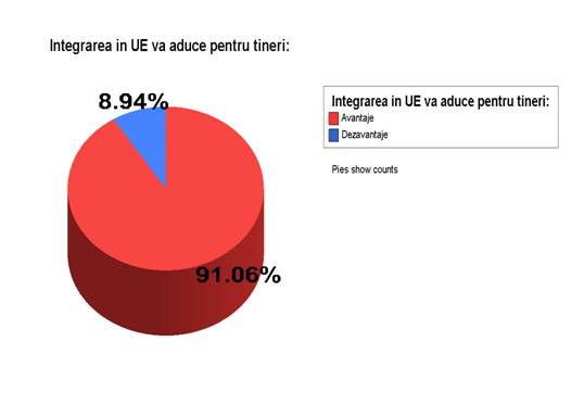 Cu acelasi optimism este vazuta integrarea in Uniunea Europeana si de catre 91,06% dintre cetatenii intervievati de noi, care considera ca aceasta va aduce o serie de avnataje pentru tinerii din ziua de astazi.