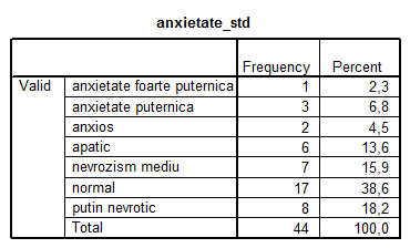 Dupa cum reiese din datele prezentate mai sus, din totalul subiectilor 13,64% sunt apatici, 38,64% au un nivel normal al anxietatii, iar la toti ceilalti este prezenta anxietatea.