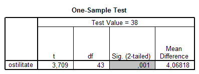Pentru a afla daca nivelul de ostilitate este semnificativ mai crescut la subiectii abuzati comparativ cu restul populatiei, am comparat rezultatele subiectilor nostri cu media populatiei la ostilitate (38). Ca procedura statistica am utilizat Testul „t” pentru un singur esantion: