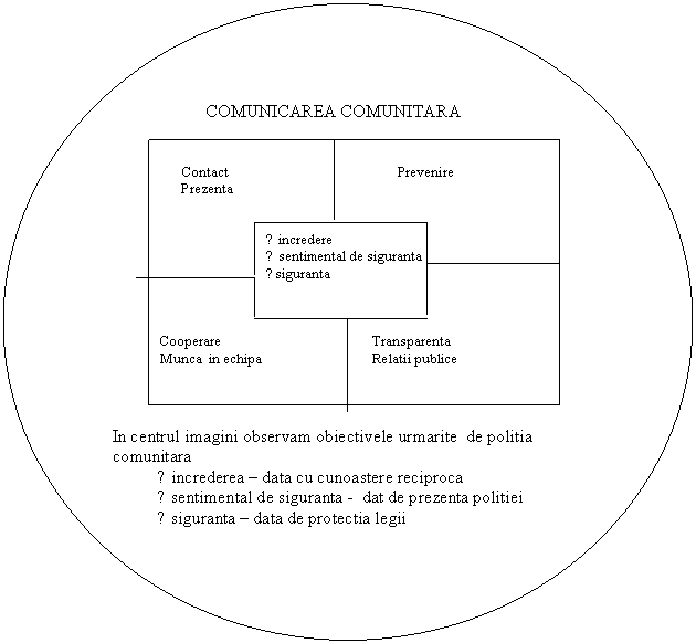 Plecand de la aceste considerente apreciez ca este mai mult decat utila o extindere a interesului in relatiile politie-comunitate,urmarindu-se elaborarea unor metodologii de actiune care sa aiba la baza principiile descentralizarii si a stransei interactiuni intre cetateni si politie,in calitate de coautori ai sigurantei publice.Aceasta filozofie se bazeaza pe convingerea ca identificarea si diminuarea factorilor care favorizeaza ..... depinde de instituirea unor forme noi de relatii intre politie si persoanele din comunitate,care sa permita acestora din urma participarea active la stabilirea prioritatilor activitatii politiei si implicarea ei in eforturile de ameliorare a calitatii vietii.