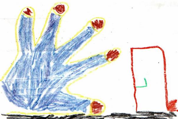 a povestit ca au o usa rosie (în realitate usa era alba), dupa care a si desenat-o împreuna cu mâna