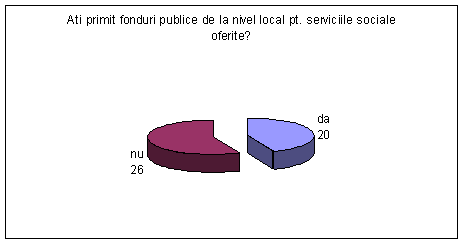 In ce priveste obtinerea de fonduri publice pentru serviciile oferite beneficiarilor, 20 au declarat ca au luat fonduri publice, in timp ce 26 nu au avut astfel de finantari. Tipurile de unitati de asistenta sociala care au obtinut finantare din fonduri publice sunt: centre de zi pentru persoane cu dizabilitati, servicii de ingrijire la domiciliu, centre medico-sociale, centre de zi pentru copii si persoane varstnice, case de tip familial etc. Serviciile sociale finantate sunt: recuperarea si reabilitarea, educatia, consilierea, informarea si orientarea, socializarea, terapia ocupationala, serviciile medico-sociale la domiciliu, recuperarea medicala, gazduirea etc.