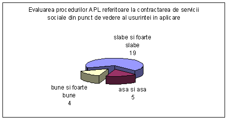 Analiza datelor din chestionare indica faptul ca procedurilor de lucru ale administratiei publice in domeniul contractarii sociale si al parteneriatului public-privat din punctul de vedere al usurintei in aplicare sunt slabe si foarte slabe in opinia a 19 dintre organizatii si bune si foarte bune numai pentru 4 dintre respondenti.