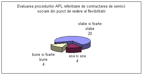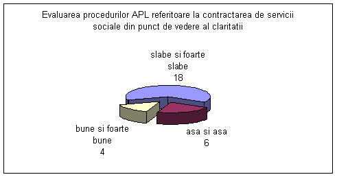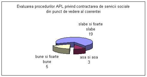 Analiza acestor date din chestionare indica o situatie ingrijoratoare in ce priveste aceste proceduri de lucru ale administratiei publice in domeniul contractarii sociale care sunt considerate slabe si foarte slabe din punct de vedere al usurintei in aplicare, coerentei, flexibilitatii si claritatii.