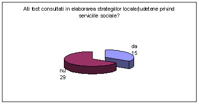 In ce priveste consultarea ONG-urilor la elaborarea strategiilor si bugetelor locale in domeniul asistentei sociale, datele cercetarii cantitative si calitative indica o participare slaba a organizatiilor neguvernamentale la elaborarea strategiilor si foarte slaba, aproape nula, la definitivarea bugetului alocat serviciilor sociale. In procesul de elaborare al strategiilor ONG-urile sunt consultate pe aspecte punctuale si rareori pe documentul final. Autoritatile publice au declarat ca strategia apartine administratiei si este necesar sa fie prezentata numai dupa definitivare publicului larg: "Strategiile nu sunt facute cu consultarea ONG-urilor. Suntem invitati cand in proiectul respectiv scrie parteneriat si nu au ce sa faca." (reprezentant ONG)