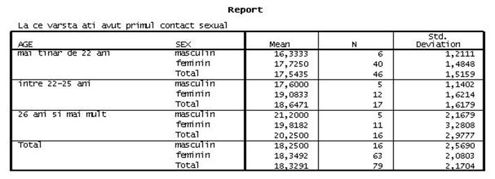 Tabel 1 Mediile si abaterile standard a varstei inceperii vietii sexuale pe categorii de varsta si sexe
