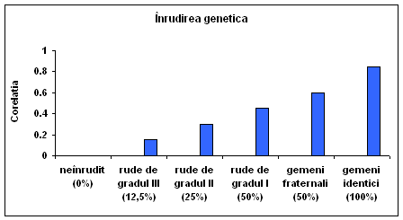 Corelatiile pentru rezultatele testului de inteligenta arata ca aceasta asemanare in cadrul familiei depinde de gradul lor de inrudire genetica. Corelatia testului de inteligenta pentru perechile de indivizi luati la intamplare din populatie este de 0,00. Corelatia pentru veri este de aproximativ 0,15; pentru demifrati care au doar un parinte in comun corelatia este de circa 0,30. Pentru frati adevarati, care au ambii parinti in comun, corelatia este de 0,45, aceasta corelatie este similara cu aceea dintre parinti si copii. Rezultatul corelatiei pentru gemenii fraternali (DZ) este de aproximativ 0,60 iar gemenii identici (MZ) se coreleaza aproximativ 0,85. Sotii si sotiile se coreleaza aproximativ 0,40 care are implicatii in interpretarea corelatiilor la frati si la gemeni.