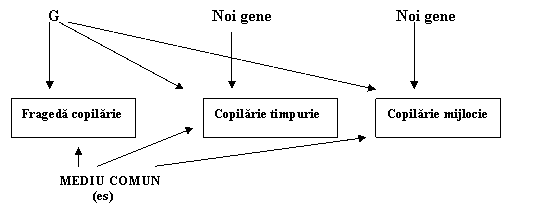 Fig. 3.7. Factorii genetici (G) contribuie atat la schimbarea cat si la contitnuitatea lui g in timpul copilariei. Mediul comun (Es) contribuie doar la continuitate.