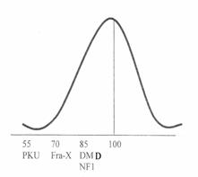 Cele mai frecvente maladii monogenice ce cauzeaza retardare mentala sunt redate in fig. 3.9. in care este indicata valoarea medie a C.I. a indivizilor cu anumite tulburari (fenilcetonuria, Fra-X, distrofia musculara Duchenne si neurofibromatoza), cu toate ca gama functiei cognitive este foarte larga pentru aceste tulburari.