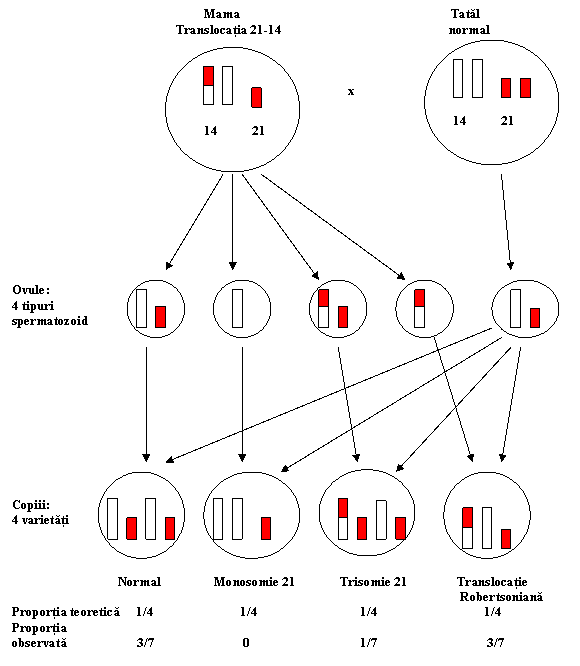 Translocatia 21/14 este mostenita, de regula de la mama. Acestea au un caracter preferential deoarece 90% dintre ele implica un cromozom 21 si un cromozom 14 si numai 10% un cromozom 21 si un cromozom 15. Indivizii cu translocatia 21/14 au in mod obisnuit un parinte cu aceeasi conditie. Asa cum rezulta din figura 3.10., translocatia de la mama este balansata in sensul ca are o cantitate de material cromozomial normal si in consecinta ea apare fenotipic normala. Cu toate acestea, gametii produsi de parintele matern sunt atat balansati cat si cu translocatii nebalansate dar si normali.