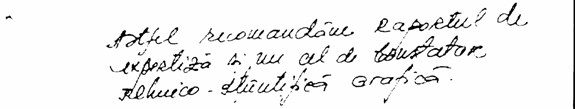 In examinarea semnelor grafice si in aprecierea in ceea ce ele au intr-adevar carcteristic din punctul de vedere al grafotehnicii se ia ca punct de reper modelul caligrafic , retinandu-se indeosebi abaterile de la acesta.