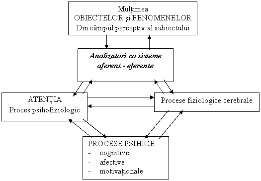 Atentia nu dispune de un continut reflectoriu propriu, de un continut informational specific, ci ea asigura declansarea, mentinerea si optimizarea proceselor psihice cognitive. Declansarea atentiei focalizate este concomitenta cu declansarea de catre un obiect-stimul a perceptiei, sau prin reglare voluntara -a reprezentarii, a memorarii reactualizarii, gândirii, imaginatiei, praxiilor etc. Deci, se poate spune ca atentia este un nod-releu al vietii si activitatii psihice (Fig. 5.1 ).