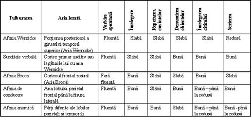 Prezentăm, după datele lui Neil R.Carlson (1991), un tabel al tulburărilor de tip afazic raportate la vorbire-întelegere-scriere.