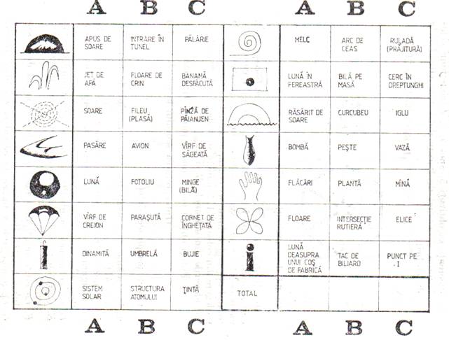 Priviti desenele. Pentru fiecare desen sunt propuse trei interpretari (A, B, C). Pe care dintre ele o alegeti? Spre a vedea ce fel de imaginatie aveti, faceti totalul optiunilor dumneavoastra, acordând 3 puncte pent 11211w2220l ru o alegere din coloana A, 2 puncte pentru B si 1 punct pentru alegerile din coloana C.