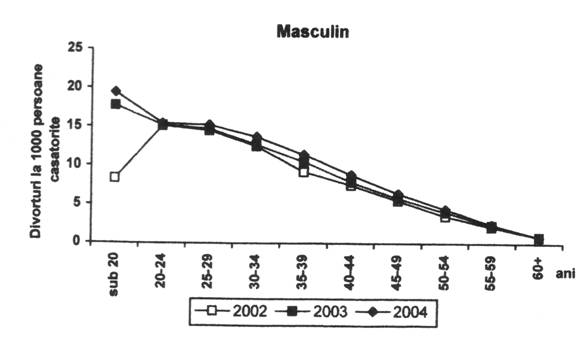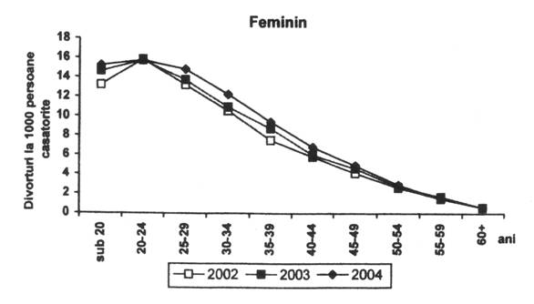 Comparativ cu anii anteriori, in 2004 s-au inregistrat cresteri ale ratelor divortialitatii la majoritatea grupelor de varsta; cele mai semnificative au fost la persoanele de 40-44 ani. S-a mentinut insa diferenta pe sexe: pana la 30 de ani numarul femeilor care au divortat a fost de aproximativ 1,7 ori mai mare decat cel al barbatilor, dupa aceasta varsta numarul barbatilor divortati depasindu-l pe cel al femeilor. Frecventa cea mai mare a divorturilor s-a inregistrat la grupa de varsta 30-34 ani la barbati si 25-29 ani la femei, desi valorile nu sunt ridicate.