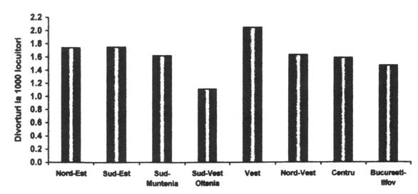Se observa din histograma ca cea mai mare rata a divortialitatii se inregistreaza in regiunea de Vest a tarii, iar cea mai mica in zona Sud-Vest Oltenia; Nord-Vest-ul tarii se situeaza intre cele doua extreme.