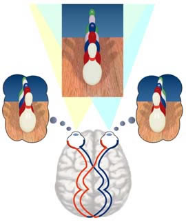 Punānd cap la cap cele doua imagini, creierul deduce situarea obiectelor in spatiu si distanta la care se afla aceasta face posibila vederea tridimensionala (vederea īn spatiu).