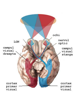 , daca īti fixezi ochii asupra unui punct, informatia din stanga punctului se indreapta spre emisfera dreapta, iar informatia din dreapta merge spre emisfera stanga.